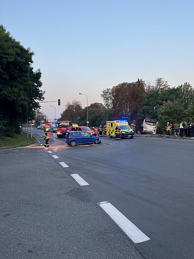 V karlovarské Horově ulici ve čtvrtek ráno po nehodě sjel autobus ze svahu do železničního kolejiště. (19. září 2024)