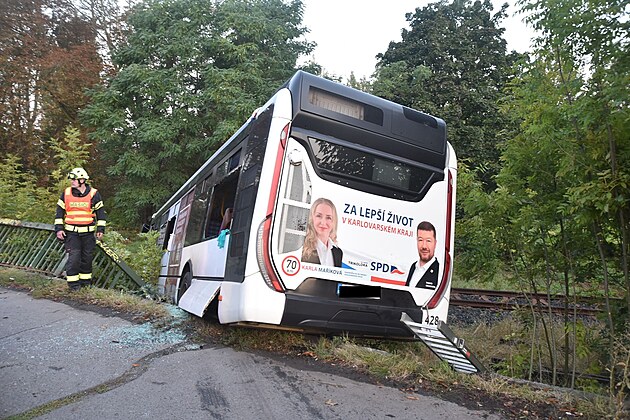 Po střetu s osobním vozidlem skončil autobus v kolejišti. (19. září 2024)
