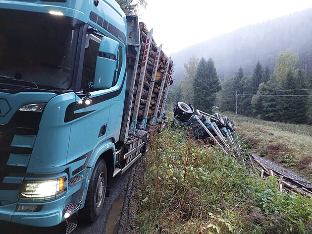 Přívěs se dřevem se nedaleko Kraslic převrátil přímo do kolejiště.