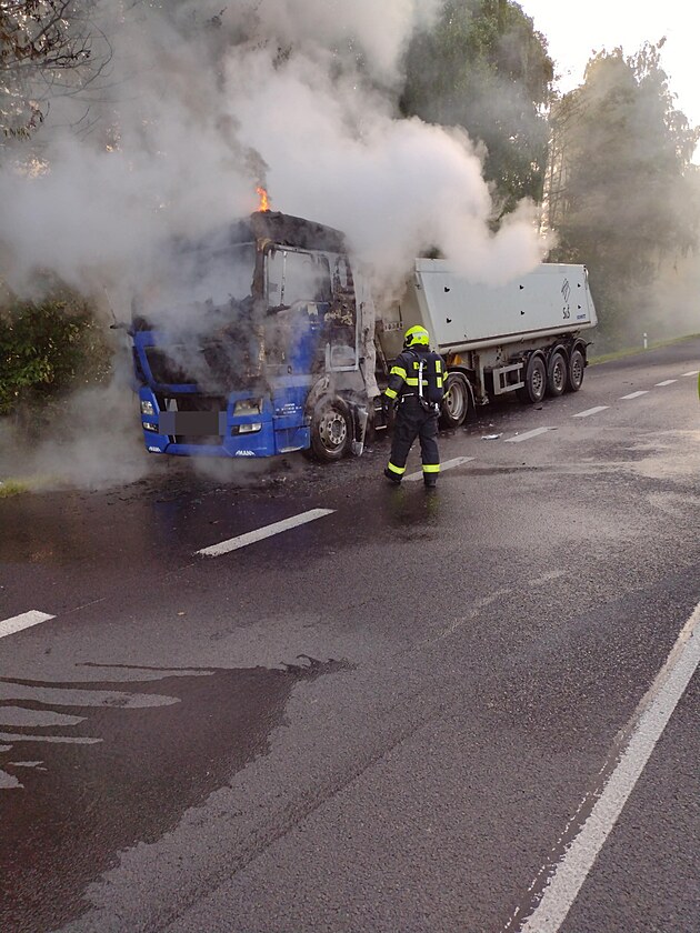 Ranní požár kamionu u Olšových Vrat způsobila technická závada na tahači. 27. června 2025