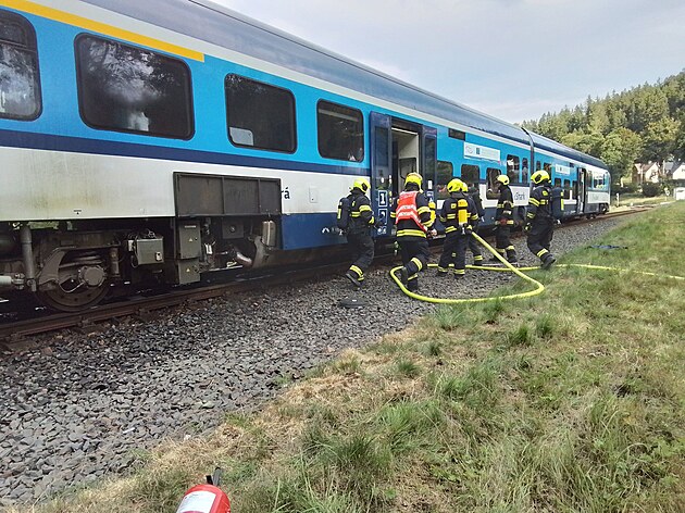 Hasiči vyjížděli k požáru osobního vlaku u Nejdku. Nikomu z cestujících se nic nestalo. (27. července 2025)