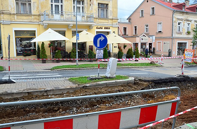 Část Hlavní třídy v Mariánských Lázních je v současnosti rozkopaná a její oprava značně komplikuje dopravu ve městě. (1. října 2024)