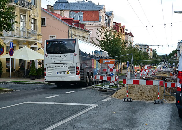 Část Hlavní třídy v Mariánských Lázních je v současnosti rozkopaná a její oprava značně komplikuje dopravu ve městě. (1. října 2024)