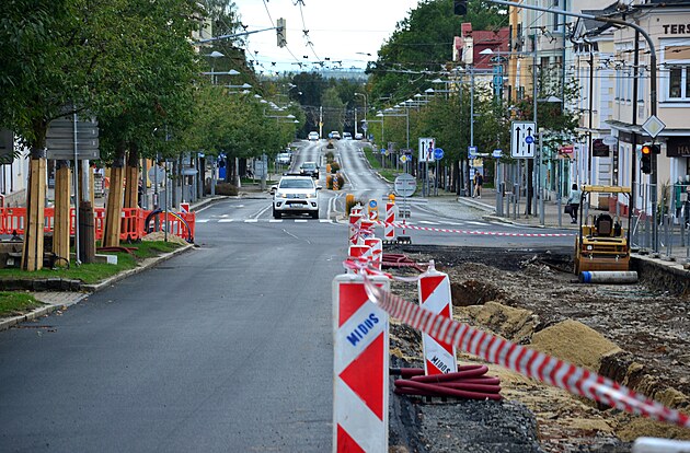 Část Hlavní třídy v Mariánských Lázních je v současnosti rozkopaná a její oprava značně komplikuje dopravu ve městě. (1. října 2024)