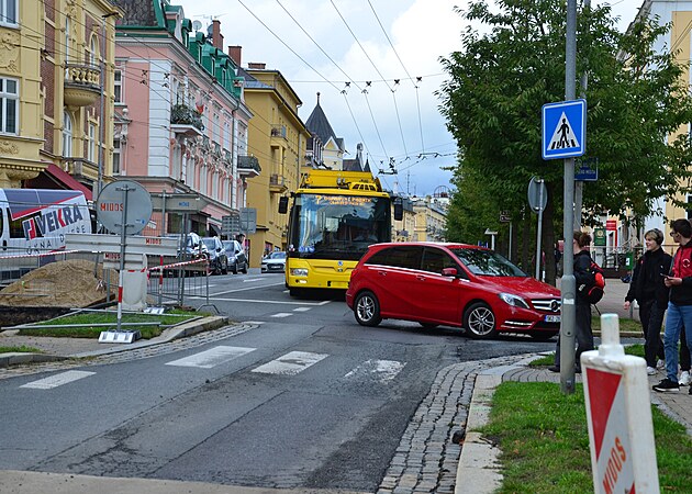 Část Hlavní třídy v Mariánských Lázních je v současnosti rozkopaná a její oprava značně komplikuje dopravu ve městě. (1. října 2024)