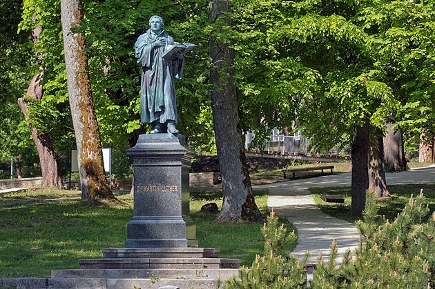 Park historie v Aši. Pomník Dr. Martina Luthera na kraji parku.
