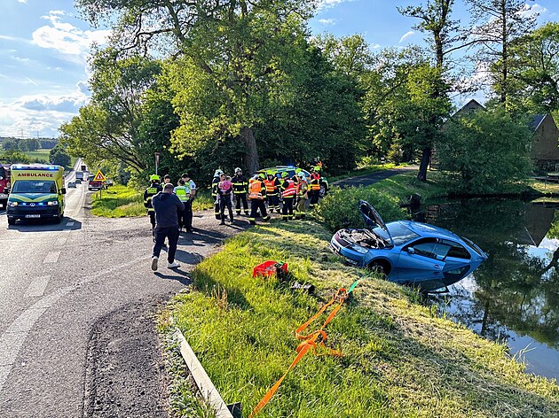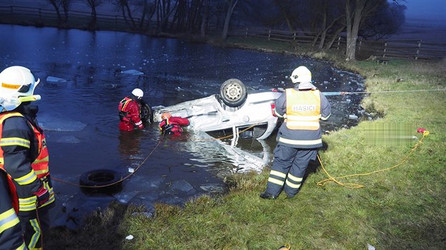 Havarované auto vyprostili z rybníka u Herstošic hasiči.