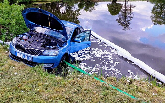 Havarované auto vyprostili z rybníka u Herstošic hasiči.