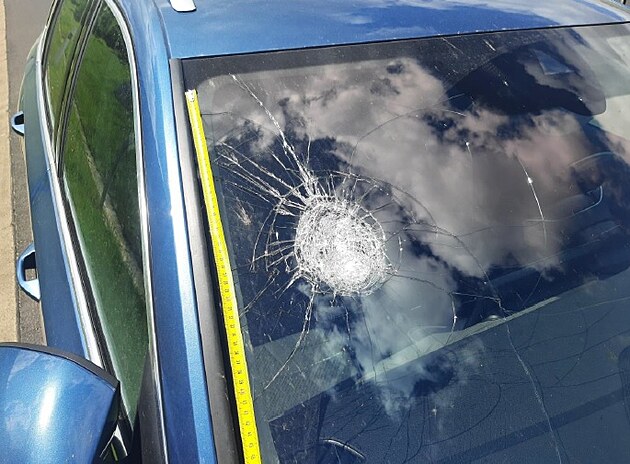 Čelní sklo auta, na které dva chlapci hodili z mostu baterii.