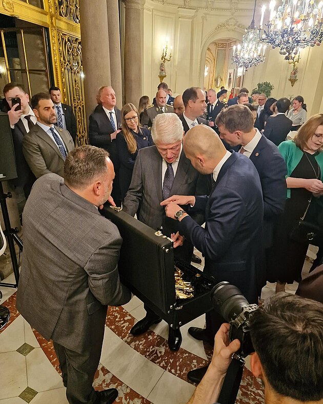 Předání saxofonu české výroby bývalému americkému prezidentovi Billu Clintonovi (11. března 2024)