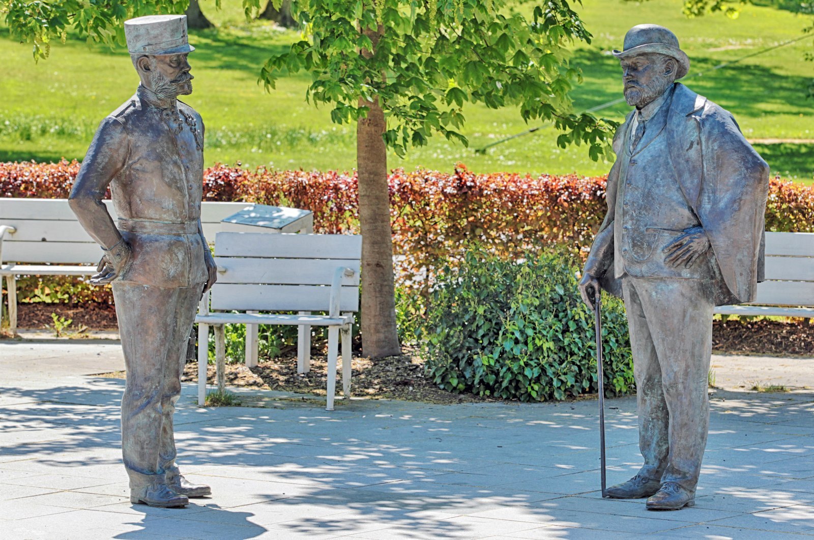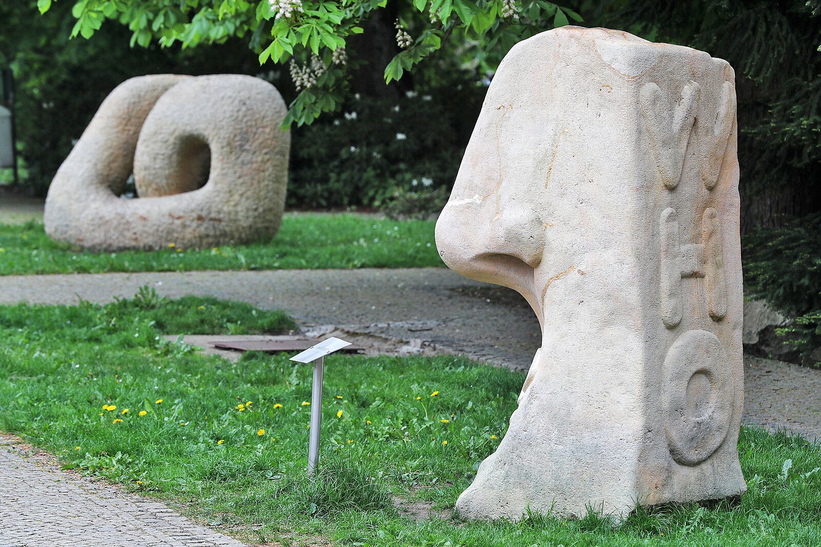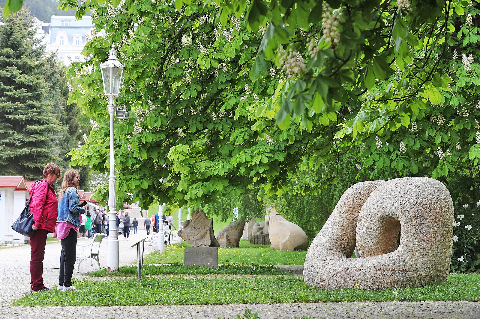 Sochy z kamenického sympozia, které stojí na cestě v parku od Hlavní ulice ke kolonádě.