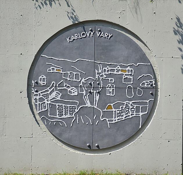 Betonovou protihlukovou stěnu v mariánskolázeňské Plzeňské ulici ozdobily první čtyři reliéfní obrazy lázeňských měst. (3. srpna 2024)