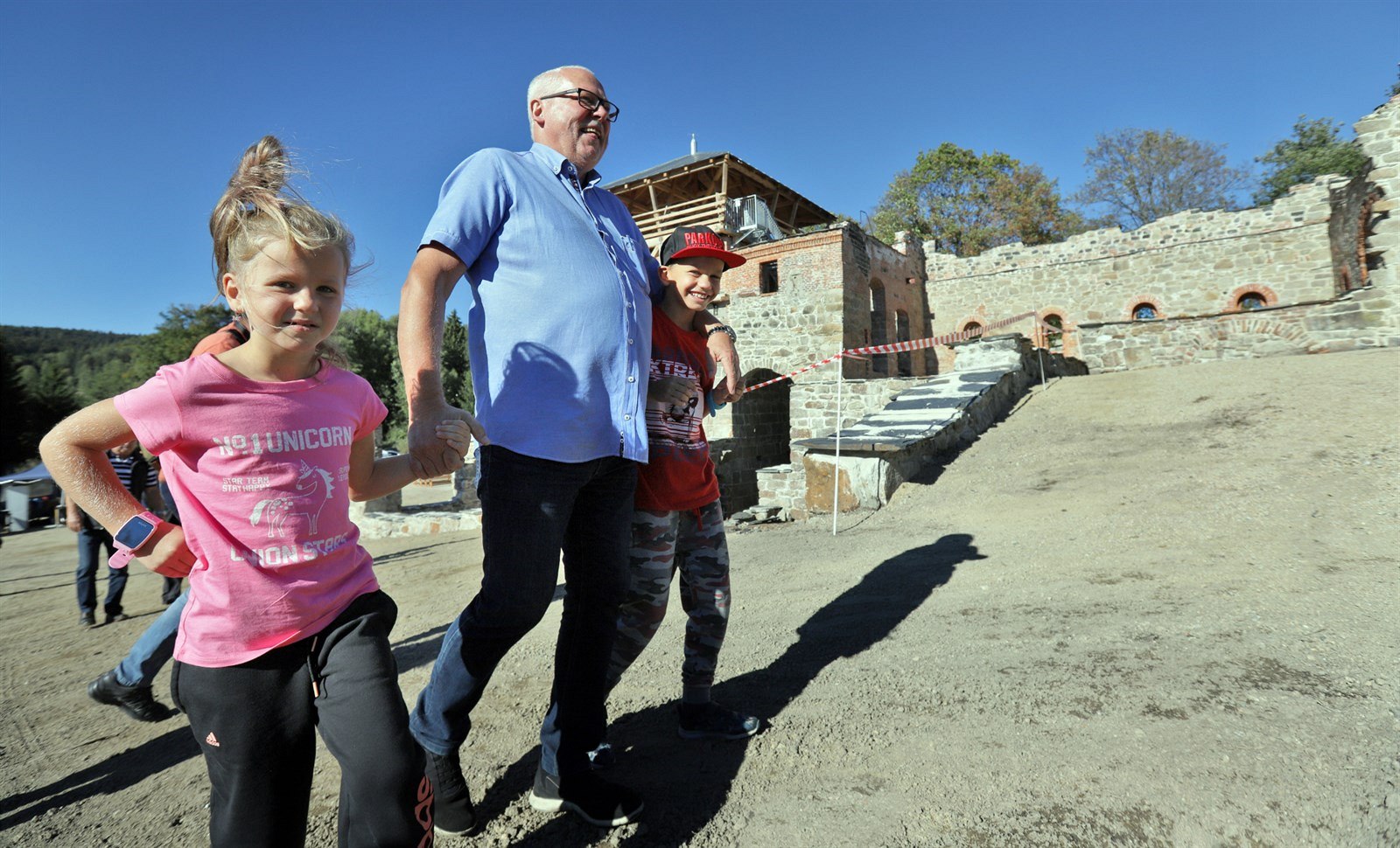 Vysoká pec s nově zbudovanou vyhlídkou v Šindelové. Na snímku Jiří Hrůza s vnoučaty.