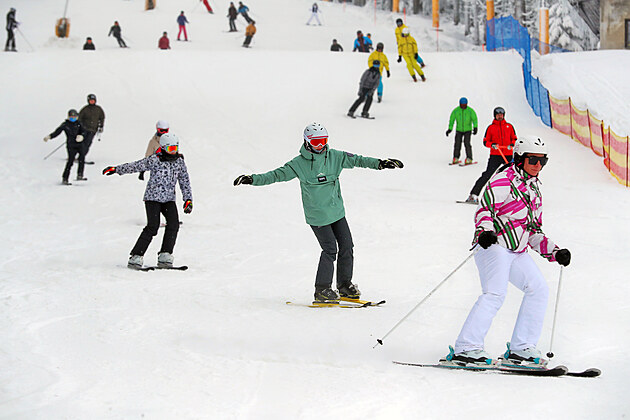 Zimní lyžařská sezona na Klínovci začala. V provozu je modrá sjezdovka Dámská v celé její délce 1240 m obsluhovaná nejnovější klínoveckou lanovkou s vyhřívanými sedačkami. (10. prosince 2022)