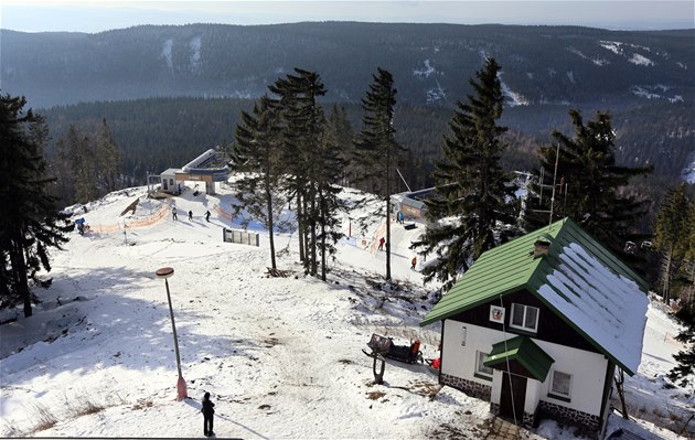 Pohled na horní stanice lanovek LD Pstruží a LD Modesgrund a stanici Horské služby v novém lyžařském areálu na krušnohorském Plešivci.