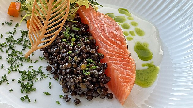 Komisi nabídl předkrm v podobě opáleného gravlaxu z lososa s čočkou beluga, frizé salátek s koprem a nakládanou dýní hokkaido. Předkrm okořenil listový chips s omáčkou z podmáslí, citrónové kůry a koprového oleje.