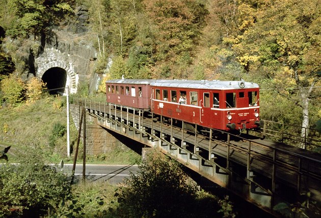 Motorový vůz řady M 131.1 na ocelovém mostě přes silnici do Horního Slavkova