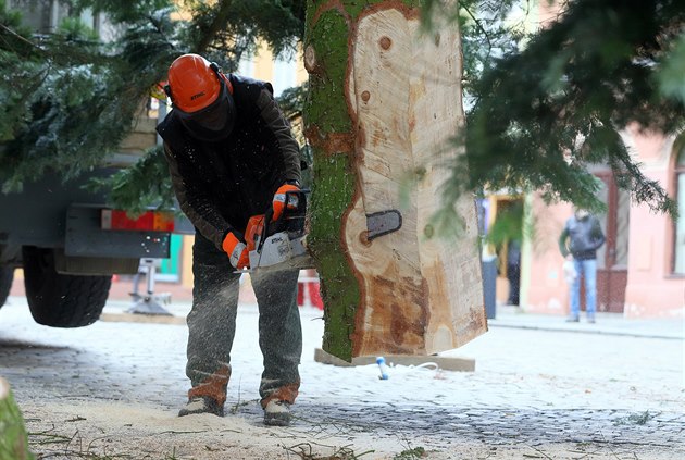 Stavění vánočního stromu na chebském náměstí. Třicetiletá jedle z Dolního Žandova měří 24 metrů a váží 4,6 tuny.