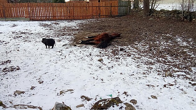 Mrtvý kůň na statku v Čichalově na Karlovarsku