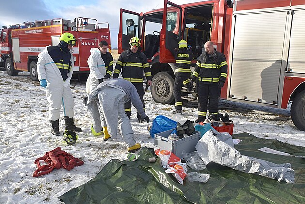 Hasiči pomáhali na statku v Čichalově, kde bylo potřeba vyprostit uhynulá zvířata ze špatně přístupných prostor. Zasahovali v ochranných oblecích. (15. ledna 2025)