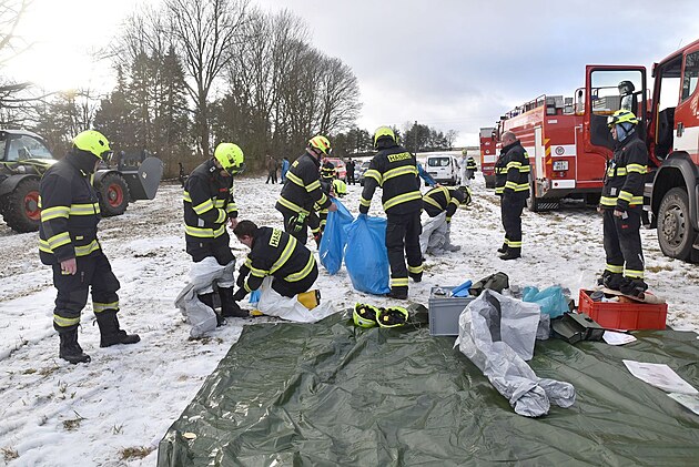 Hasiči pomáhali na statku v Čichalově, kde bylo potřeba vyprostit uhynulá zvířata ze špatně přístupných prostor. Zasahovali v ochranných oblecích. (15. ledna 2025)