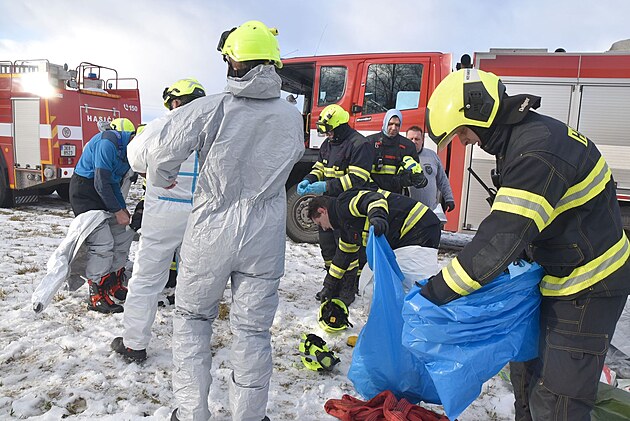 Hasiči pomáhali na statku v Čichalově, kde bylo potřeba vyprostit uhynulá zvířata ze špatně přístupných prostor. Zasahovali v ochranných oblecích. (15. ledna 2025)