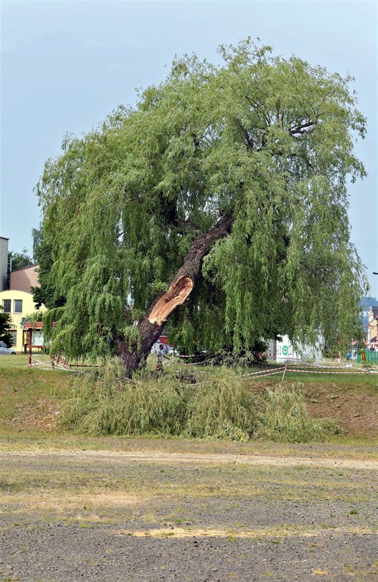 Tuhnická vrba přežila bombardování i likvidaci blízkého depa, teď se jí ale zlomila jedna z korunních větví napadená hnilobou. (1. května 2025)