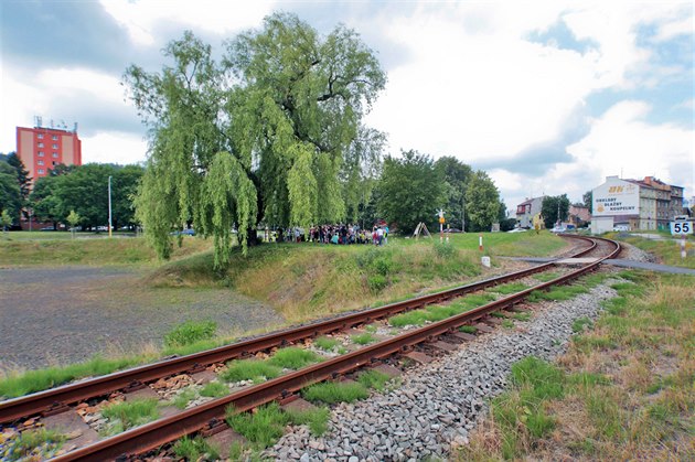 Tuhnická vrba, která přežila bombardování i demolici depa. Dnes už má vlastní informační tabuli.
