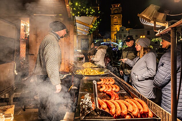 Opečené klobásy i další dobroty nabízejí stánkaři na trhu na hradeckém Velkém náměstí. (3. prosince 2025)