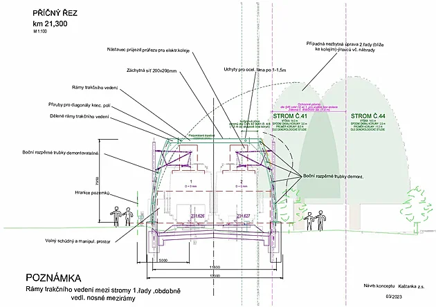 Spolek Kaštanka v roce 2023 navrhl vybudování ochranného rámu podél budoucí dvoukolejky v Opatovické ulici v Hradci Králové. Rám by zamezil riziku pádu stromů a řešil by i problém vzdálenosti neizolovaného vodiče, troleje, od zeleně, odkloněné konstrukcí. Většinu aleje by se tím podařilo zachovat. Na snímku je jeden z řezů.