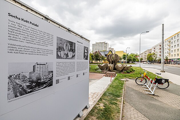 Informační panel o soše Květ Polabí na zadní straně AlzaBoxu na třídě SNP v Hradci Králové.