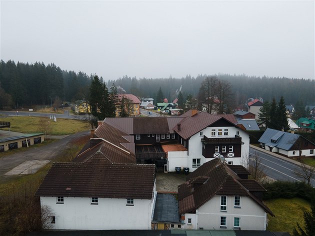 Hotel Karolína, který patří k nejstarším v Harrachově, stojí při hlavní silnici na Polsko.