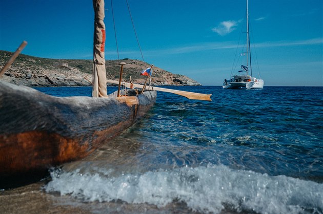 Expedice Monoxylon III pluje v neolitickém člunu po Egejském moři (1. 6. 2019).
