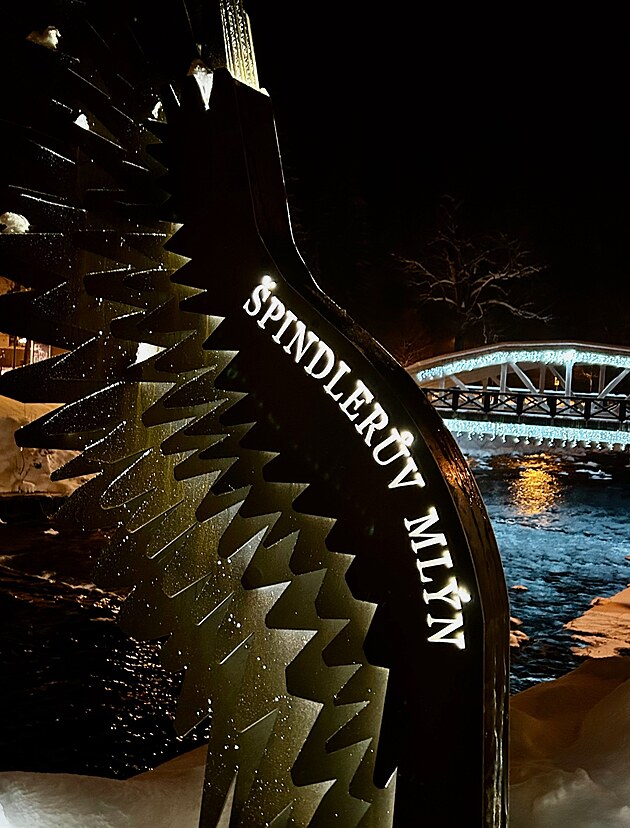 V noci z andělských křídel v centru Špindlerova Mlýna vyzařuje světlo.