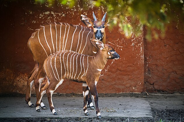 Sedmitýdenní samice bonga se starší sestrou ve výběhu (4. března 2025)