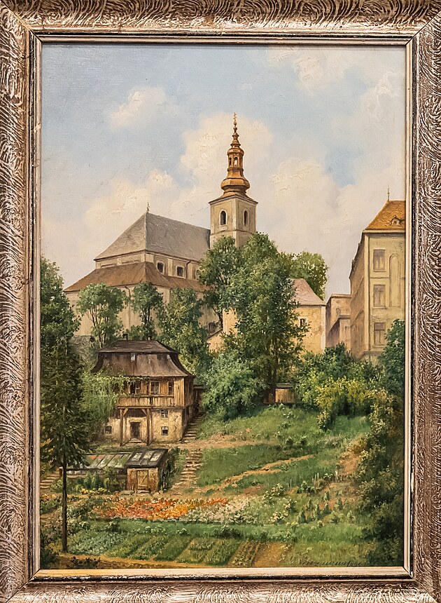 Obraz zachycuje Lachnerův dům a kostel sv. Petra a Pavla v Broumově. Dům se zahradou patříval lékárnické rodině Dauschů, pěstovali tam byliny. Dům byl zbourán v padesátých letech 20. století.