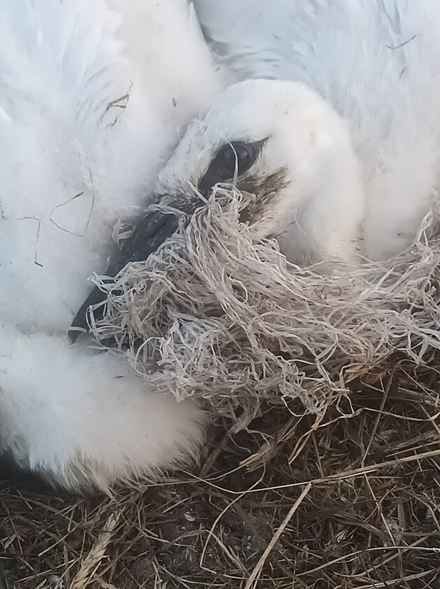 Mládě čápa v Teplicích nad Metují spolykalo síť.