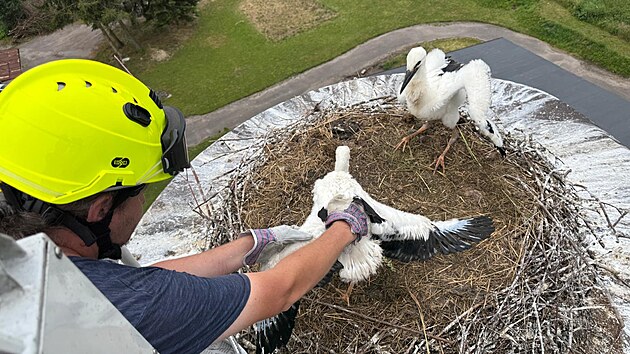 Hasiči vrátili zachráněné mládě čápa zpět na komín v Teplicích nad Metují.