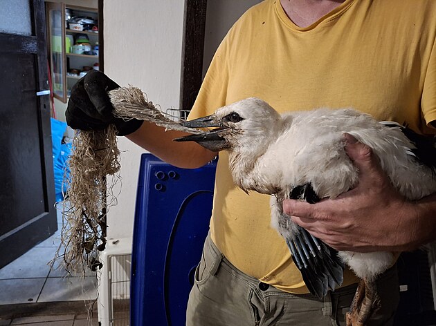 Mládě čápa v Teplicích nad Metují spolykalo síť.