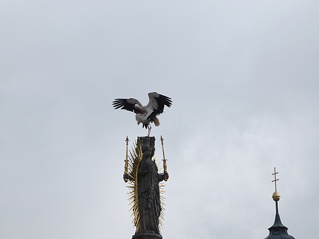 Námluvy čápů vyvrcholily odpoledne stavěním hnízda na mariánském sloupu na broumovském Mírovém náměstí. (5. června 2025)