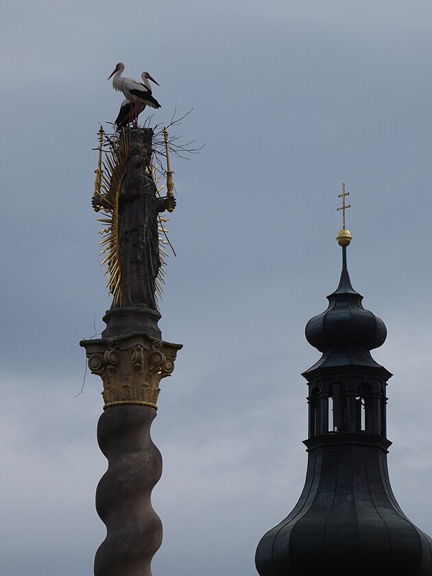 Námluvy čápů vyvrcholily odpoledne stavěním hnízda na mariánském sloupu na broumovském Mírovém náměstí. (5. června 2025)