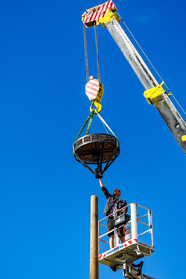 Pracovníci s autojeřábem chystají náhradní hnízdo pro čápy na broumovském náměstí.