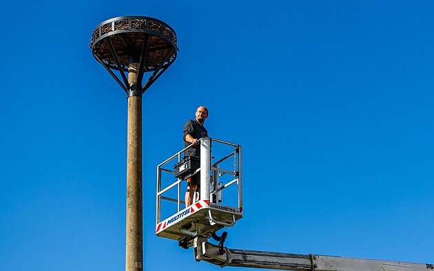 Pracovníci s autojeřábem chystají náhradní hnízdo pro čápy na broumovském náměstí.