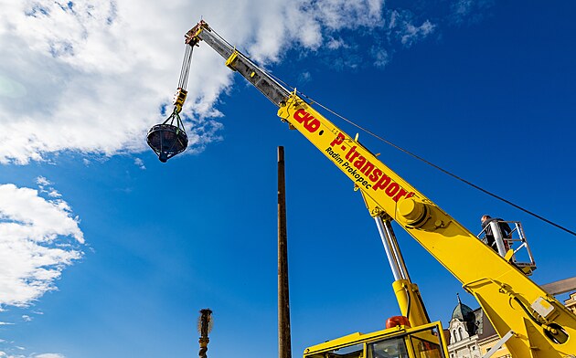Pracovníci s autojeřábem chystají náhradní hnízdo pro čápy na broumovském náměstí.