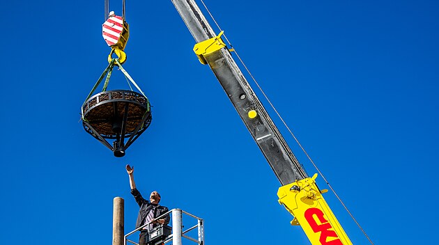 Pracovníci s autojeřábem chystají náhradní hnízdo pro čápy na broumovském náměstí.