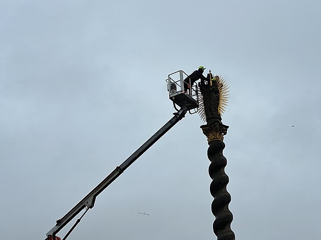 V Broumově odstranili čapí hnízdo z mariánského sloupu. (8. července 2025)