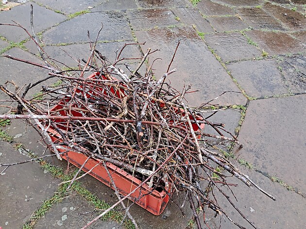 Klacky z rozebraného čapího hnízda v Broumově se vešly do dvou beden. (8. července 2025)