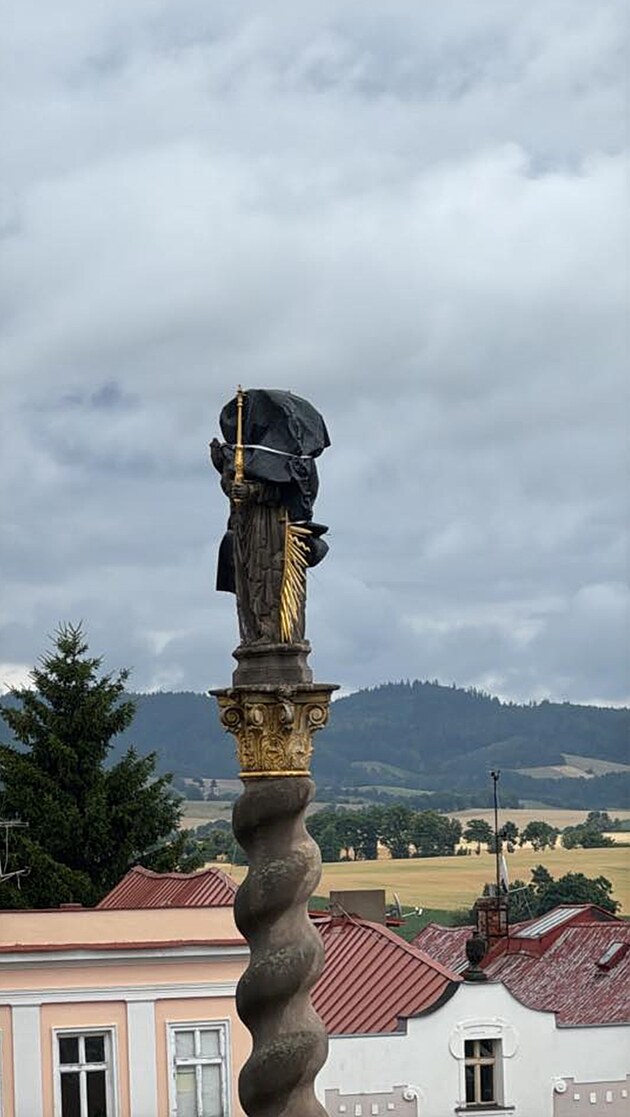 Sochu Panny Marie na barokním sloupu v Broumově zakryli geotextilií, aby odradili čápy od stavby hnízda. (8. července 2025)