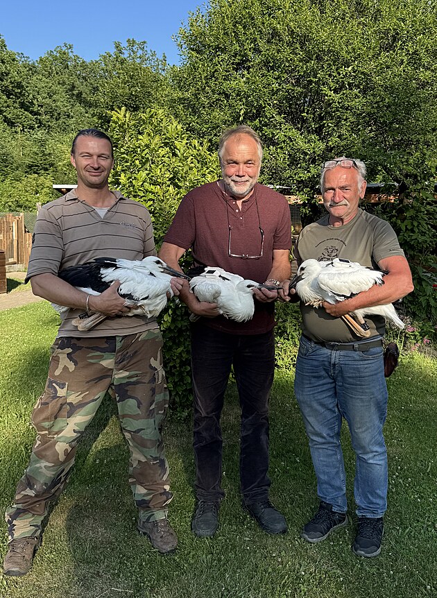 Odrostlá čápata z Rychnova v Záchranné stanici Makov na Písecku, uprostřed stojí Libor Šejna.
