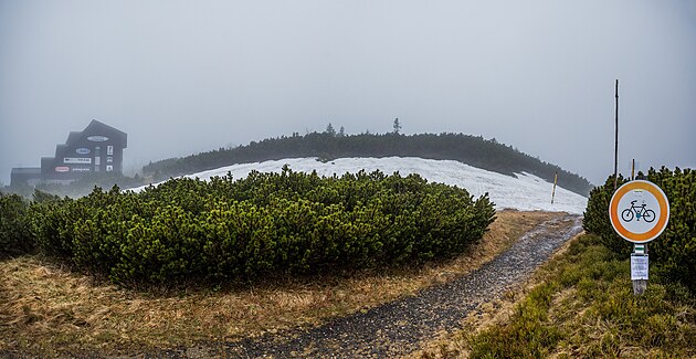 Horská bouda Výrovka v Krkonoších v mlhavém počasí (26. dubna 2018)
